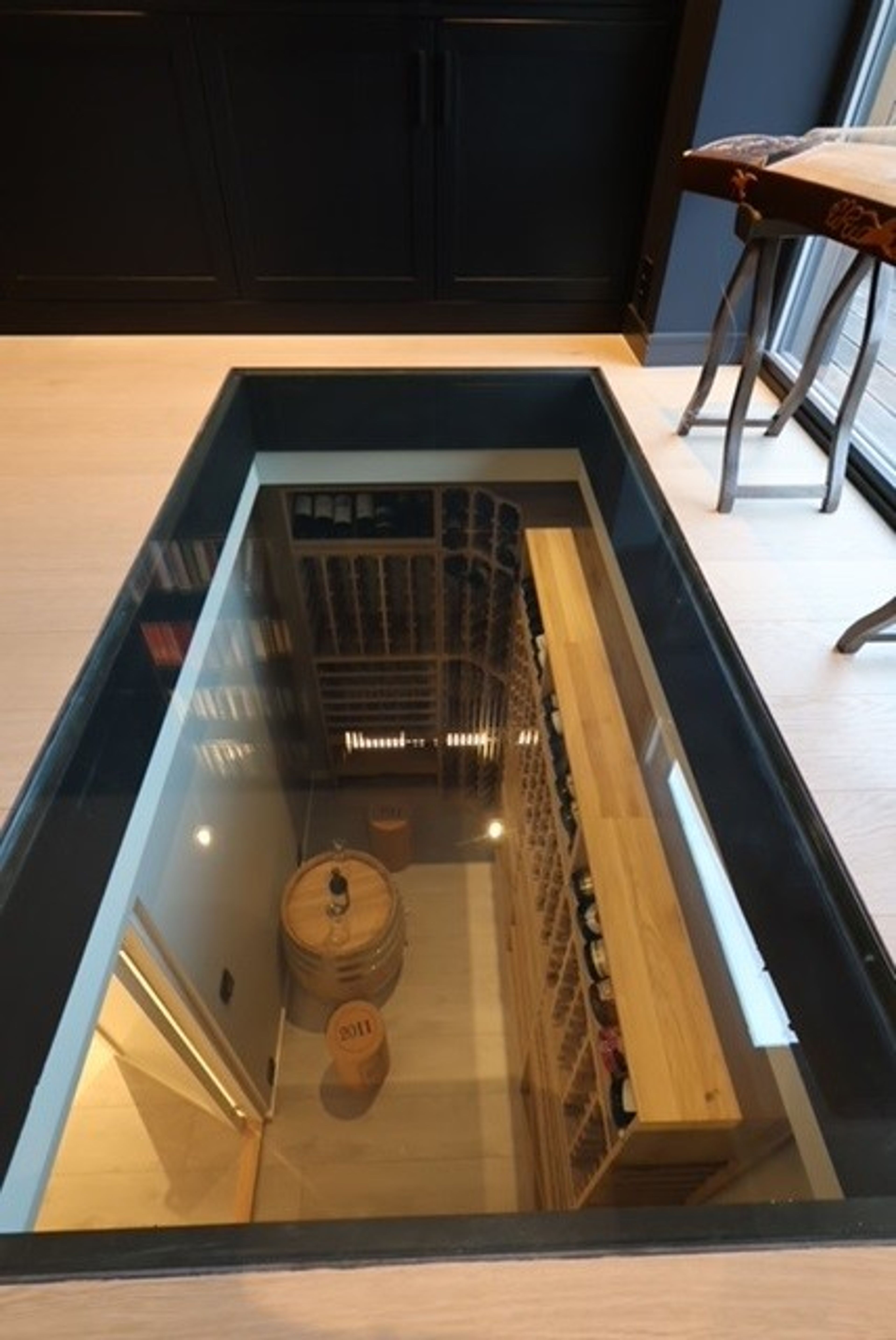 Together with the architect, they decided to create an inviting connection between the basement and the rest of the house. It turned into a wine cellar under the floor, which is why they decided to make a solid glass floor that offers a beautiful view down into the wine cellar from the library above.