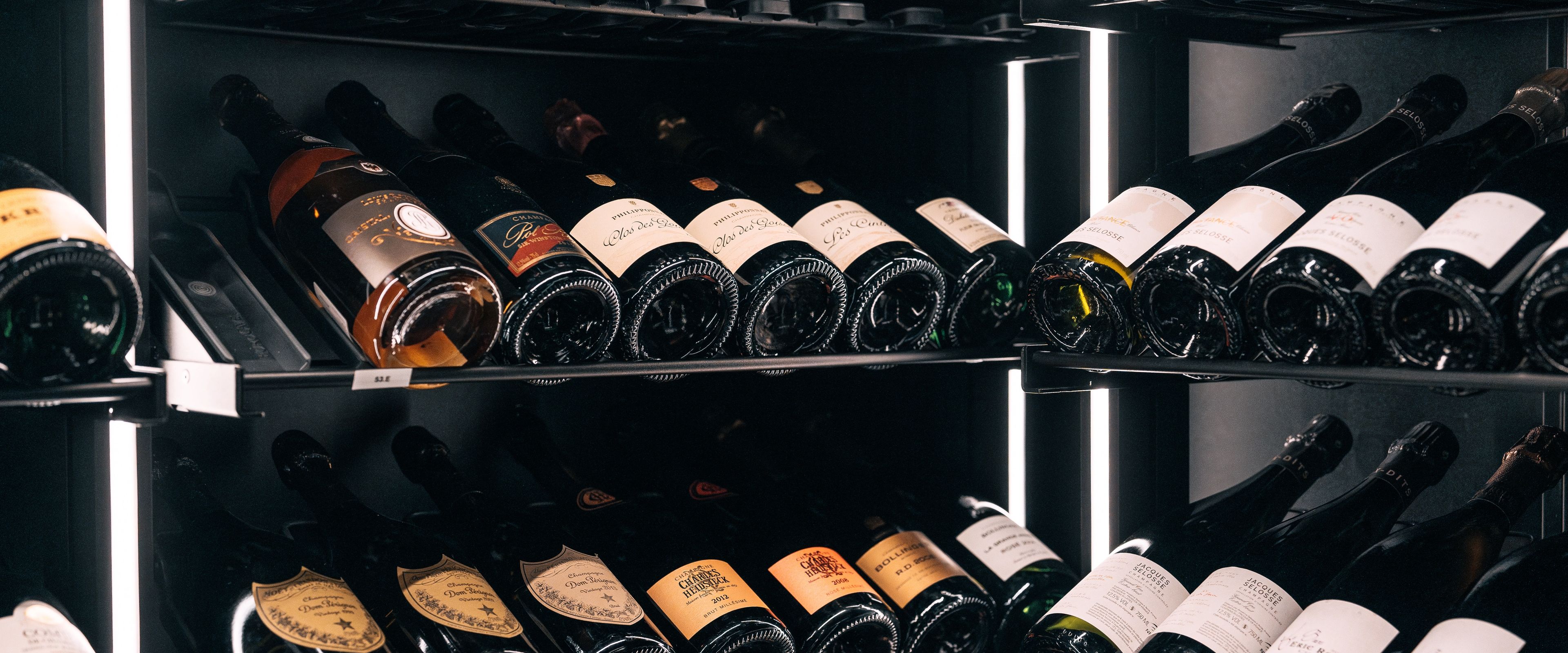 Champagne bottles, which require higher pressure and lower temperatures, should be stored at around 6-10°C. Since these bottles are wider, it is often easier to find space for them on display shelves, which give a visual representation of your collection.